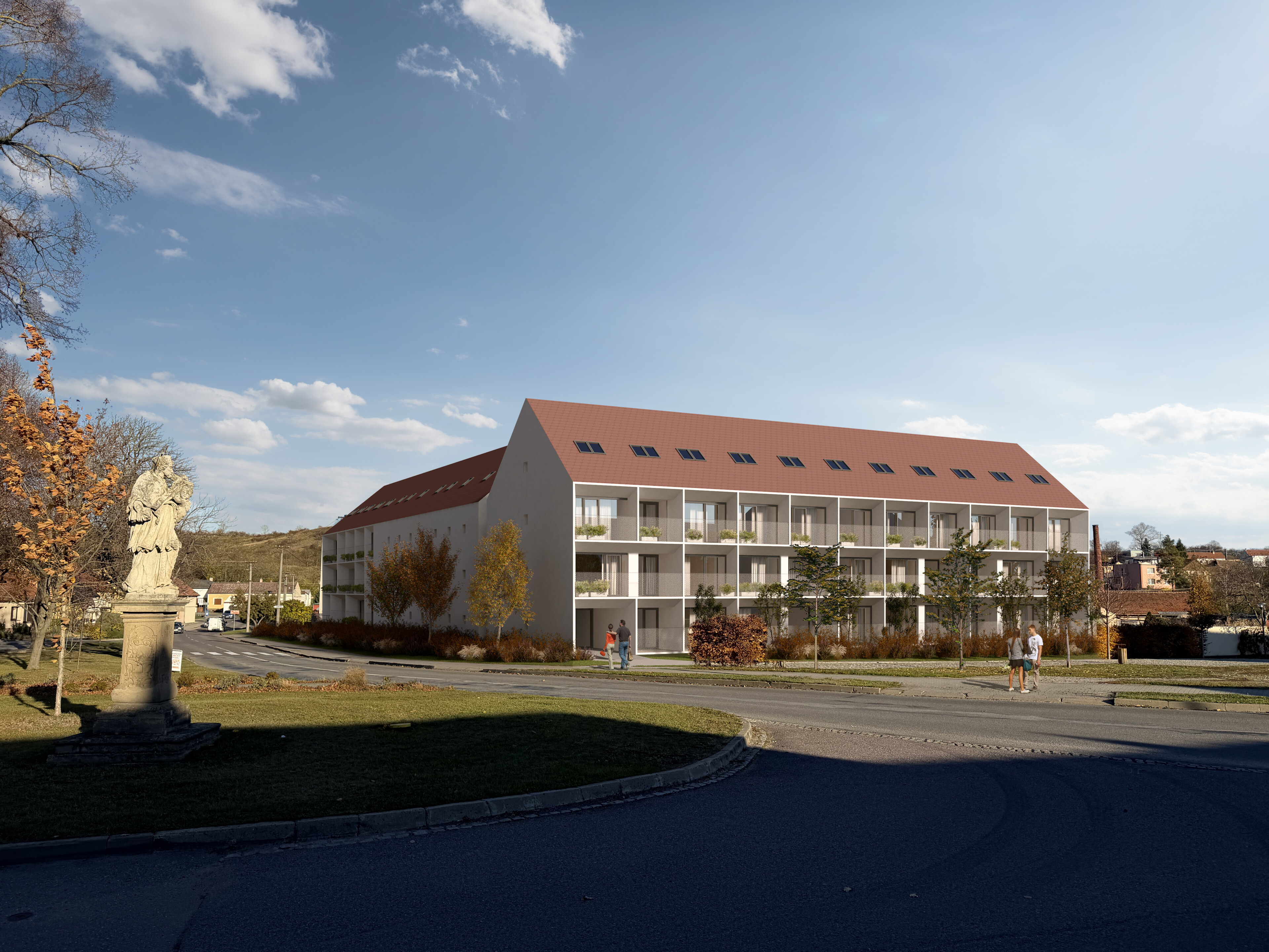 Poloha bytového domu přímo na návsi, v praktickém centru městyse Hostěradice, byla jedním z klíčových východisek návrhu a významně ovlivnila jeho celkový architektonický výraz. Cílem bylo vytvořit dům, který přirozeně zapadne do struktury obce, bude respektovat její měřítko i charakter a zároveň nabídne současné, kvalitní bydlení.